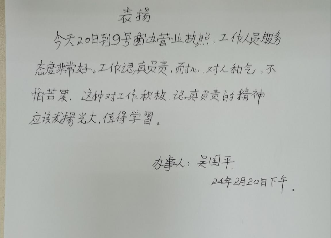 2月20日下午,钟村街道便民服务中心收到春节后第一封表扬信。原来就在当天,吴先生在中心9号窗办理个体工商户设立登记业务的过程中,工作人员以和气待人的良好服务态度,积极协助吴先生填写表格、耐心解答相关问题,帮助其顺利完成本次业务办理。吴先生表示,这次能如此顺利快捷地完成业务办理,多亏了9号窗工作人员的用心帮助,她认真负责、不辞劳苦的服务工作精神值得学习,希望中心将这种精神继续发扬光大。为表示感谢,吴先生特地手写了一封表扬信,对该名工作人员的服务水平给予赞扬和肯定。